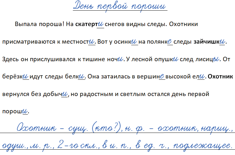 Выпала пороша! На скатерт_ снегов видны следы. Охотники присматриваются к местност_. Вот у осинк_ на полянк_ следы зайчишк_. Здесь он прислушивался к тишине ноч_. У лесной опушк_ след лисиц_. От берёзк_ идут следы белк_. Она затаилась в вершин_ высокой ел_. Охотник вернулся без добыч_, но радостным и светлым остался день первой порош_.