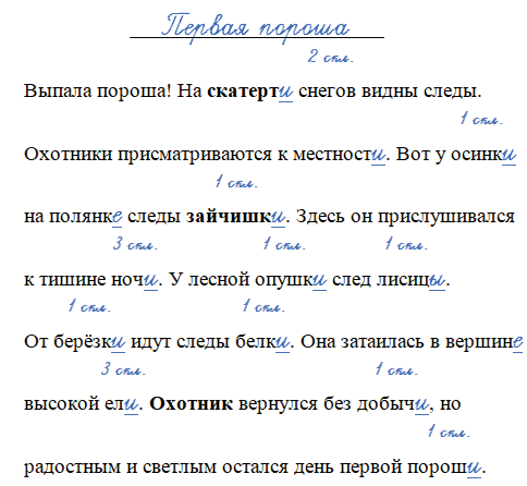 Выпала пороша! На скатерт_ снегов видны следы. Охотники присматриваются к местност_. Вот у осинк_ на полянк_ следы зайчишк_. Здесь он прислушивался к тишине ноч_. У лесной опушк_ след лисиц_. От берёзк_ идут следы белк_. Она затаилась в вершин_ высокой ел_. Охотник вернулся без добыч_, но радостным и светлым остался день первой порош_.