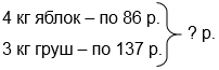1) В магазине купили 4 кг яблок по 86 р. за килограмм и 3 кг груш по 137 р. за килограмм. Какова стоимость покупки?