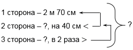 Первая сторона ограды треугольной клумбы равна 2 м 70 см, вторая - на 40 см короче первой, значит, длина второй стороны: