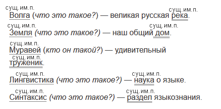 1) Волга — великая русская река. 2) Земля — наш общий дом. 3) Муравей — удивительный труженик. 4) Лингвистика — наука о языке. 5) Синтаксис — раздел языкознания.