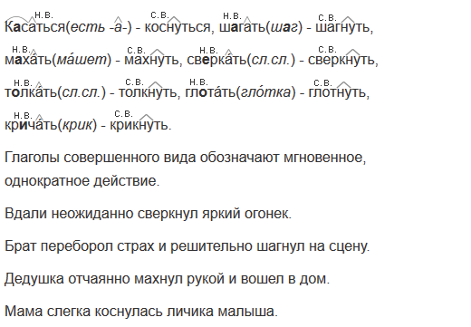 2. Глаголы какого вида обозначают мгновенное, однократное действие? С этими глаголами составьте три-четыре предложения, используя наречия слегка, отчаянно, решительно, неожиданно.