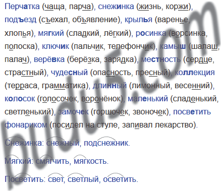 Перчатка (чаща, парча) (ча, ща пиши с а), снежинка (жизнь, коржи) (жи, ши пиши с и), подъезд (съехал, объявление) (разделительный ъ), крылья (варенье, хлопья) (разделительный ь), мягкий (мягенький) (сладкий, лёгкий), росинка (ро́сы) (ворсинка, полоска), ключик (пальчик, телефончик), камыш (шалаш, палач) (сущ. м. р. на шипящий), верёвка (верёвочка) (берёзка, зарядка), местность (место) (сердце, страстный), чудесный (чудеса) (опасность, пресный), коллекция (терраса, грамматика), длинный (лимонный, весенний), колосок (ко́лос, коло́сья) (голосочек, воронёнок), маленький (сладенький, светленький), замочек (горшочек, звоночек), посветить (свет) фонариком (посидел на стуле, запивал лекарство).