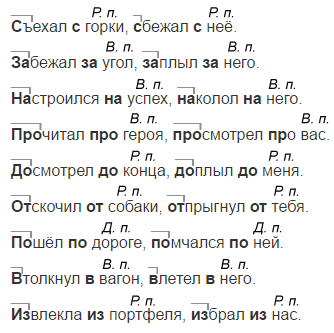 Составьте словосочетания из глагола с приставкой и имени существительного или личного местоимения с предлогом. Приставка и предлог в словосочетаниях должны быть одинаковыми: с, за, на, про, до, от, по, в, из. Запишите. Укажите над именами существительными и местоимениями падеж.