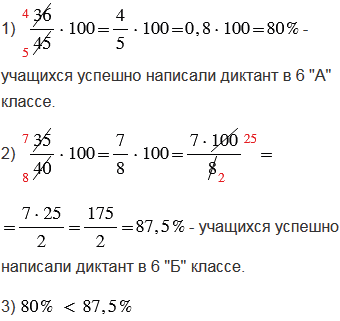 Диктант в 6"А" успешно написали 36 учащихся, а в 6"Б" - 35 учащихся. Какой класс лучше написал диктант, если в 6 "А" 45 учеников, а в 6 "Б" 40 учеников?