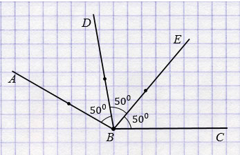 Построим угол АВС, равный 1500, и разделим его на три равных угла, то есть три угла по 500, так как
