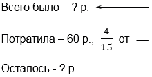 имевшихся у нее денег. Значит, 60 р. составляют 4 части, а все имеющиеся у Наташи деньги составляют 15 частей, следовательно, чтобы узнать, сколько всего денег было у Наташи, нужно 60 разделить на 4 (тем самым найдем сколько рублей составляет одна часть) и умножить полученный результат на 15. Получается, всего у Наташи было: