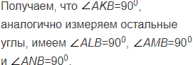4) Измерьте углы AKB, ALB, AMB и ANB. Сделайте предположение о величине этих углов.