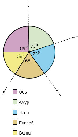 Чертим луч с началом в центре круга, который пройдет через отмеченную точку, получаем угол, равный 890, который приходится на сектор, соответствующий длине реки Обь (с Иртышом).