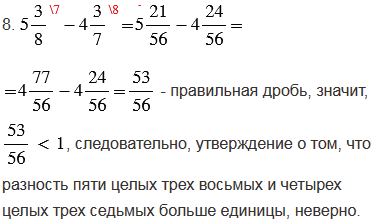 8. Разность пяти целых трех восьмых и четырех целых трех седьмых больше единицы.