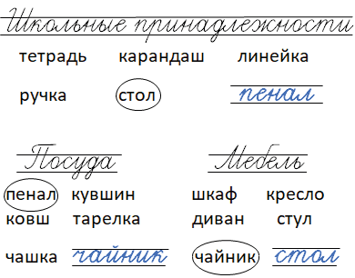 Стол не относится к школьным принадлежностям. Пенал не является посудой. Чайник не относится к мебели.
