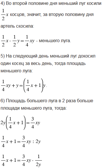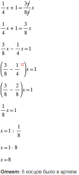 Артели косцов надо было скосить два луга, один вдвое больше другого. Половину дня артель косила большой луг. После этого артель разделилась пополам: первая артель осталась на большом лугу и докосила его к вечеру до конца; вторая же половина косила малый луг, на котором к вечеру еще остался участок, скошенный на другой день косцом за один день работы. Сколько косцов было в артели?