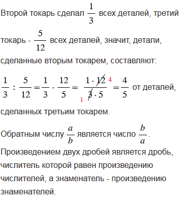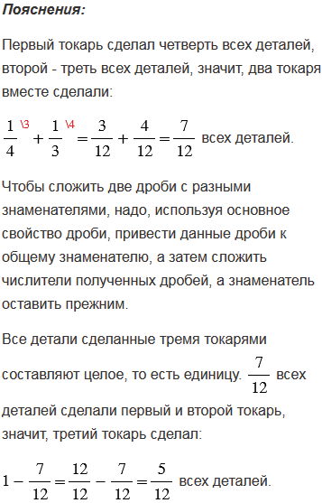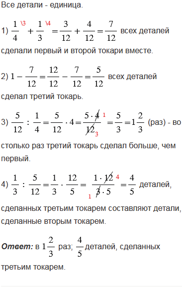 Три токаря сделали несколько деталей. Первый сделал четверть всех деталей, второй - треть всех деталей. Во сколько раз третий токарь сделал больше деталей, чем первый? Какую часть детали, сделанные вторым токарем, составляют от деталей, сделанных третьим токарем?