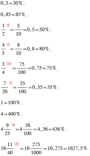 Любую десятичную дробь или любое натуральное можно записать в процентах. Для этого нужно десятичную дробь или натуральное число умножить на 100 и к результату приписать знак %.