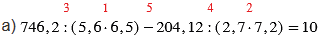 а) 746,2 : (5,6 • 6,5) - 204,12 : (2,7 • 7,2);