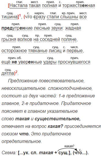 Через несколько минут ветер стих и деревья снова застыли в холодном оцепенении. Настала такая полная и торжественная тишина, что сразу стали слышны все предутренние лесные звуки: жадная грызня волков на соседней поляне, осторожное тявканье лисиц и первые, ещё не уверенные удары проснувшегося дятла. (По Б. Полевому)