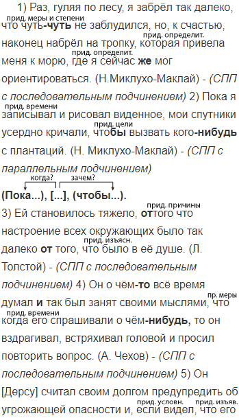 1) Раз гуляя по лесу я забрёл так далеко что чуть(чуть) не заблудился но к счастью наконец набрёл на тропку которая привела меня к морю где я сейчас(же) мог ориентироваться. (Н.Миклухо-Маклай) 2) Пока я записывал и рисовал виденное мои спутники усердно кричали что(бы) вызвать кого(нибудь) с плантаций. (Н. Миклухо-Маклай) 3) Ей становилось тяжело (от)того что настроение всех окружающих было так далеко (от)того что было в её душе. (Л. Толстой) 4) Он о чём(то) всё время думал (и)так был занят своими мыслями что когда его спрашивали о чём(нибудь) то он вздрагивал встряхивал головой и просил повторить вопрос. (А. Чехов) 5) Он [Дерсу] считал своим долгом предупредить об угрожающей опасности и если видел что его не слушают покорялся шёл молча и (ни)когда (не)спорил. (В. Арсеньев) 6) Окраска зверька до того походила на цвет коры что если(бы) он оставался неподвижным то его совершенно нельзя было(бы) заметить. (В. Арсеньев) 7) Когда я сказал что розы будут цвести всё лето если правильно срезать цветы дети были в восторге. (В. Сухомлинский) 8) Воспитанный человек это тот кто хочет и умеет счита(т, ть)ся с другими кто в равной мере вежлив и со старшими и с младшими кто строго выполняет данные другим обещания. (Д. Лихачёв)