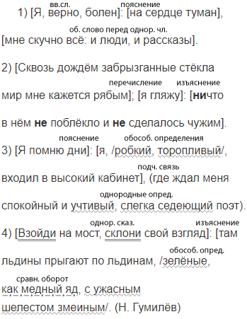 1) Я верно болен на сердце туман, мне скучно всё и люди и рассказы. 2) Сквозь дождём забрызганные стёкла мир мне кажется рябым я гляжу (ни)что в нём (не)поблёкло и (не)сделалось чужим. 3) Я помню дни я робкий торопливый входил в высокий кабинет где ждал меня спокойный и учтивый, слегка седеющий поэт. 4) Взойди на мост склони свой взгляд там льдины прыгают по льдинам зелёные как медный яд с ужасным шелестом змеиным. (Н. Гумилёв)