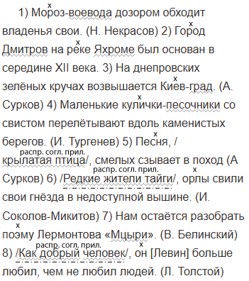 1) Мороз-воевода дозором обходит владенья свои.4 (Н. Некрасов) 2) Город Дмитров на реке Яхроме был основан в середине XII века. 3) На днепровских зелёных кручах возвышается Киев-град. (А. Сурков) 4) Маленькие кулички-песочники со свистом перелётывают вдоль каменистых берегов. (И. Тургенев) 5) Песня, крылатая птица, смелых сзывает в поход (А Сурков) 6) Редкие жители тайги, орлы свили свои гнёзда в недоступной вышине. (И. Соколов-Микитов) 7) Нам остаётся разобрать поэму Лермонтова «Мцыри». (В. Белинский) 8) Как добрый человек, он [Левин] больше любил, чем не любил людей. (Л. Толстой)