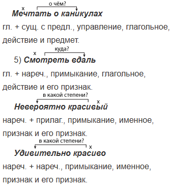 Составьте по три словосочетания, соответствующих каждой из приведённых ниже схем. Определите в каждом случае вид подчинительной связи (согласование, управление или примыкание), грамматическое значение словосочетаний (предмет и его признак; действие и предмет, на который оно переходит; действие и его признак и др.) Проведите разбор словосочетаний, следуя порядку разбора, указанному на с.242.