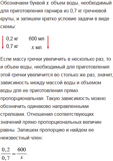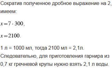 Для приготовления гарнира из 0,2 кг гречневой крупы нужно взять 600 мл воды. Сколько воды потребуется, чтобы приготовить 0,7 кг крупы?