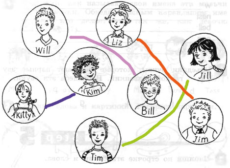 2. Послушай, как говорят друг с другом эти мальчики и девочки, и соедини имена говорящих,