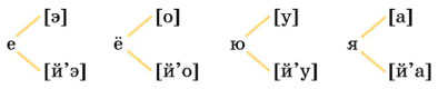 Слияние двух звуков: согласного звука и последующего гласного звука эти буквы обозначают, когда стоят в начале слова или после другого гласного: