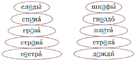 следы - след, спина - спи́ны, гроза - гро́зы, страна - стра́ны, сестра - сёстры, шкафы - шкаф, гнездо - гнёзда, плита - пли́ты, стрела - стре́лы, дожди - дождь.