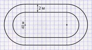 Два спортсмена должны пробежать один круг по дорожке стадиона, форма которого - прямоугольник с двумя примыкающими полукругами, у которых диаметр равен 40 м. Ширина дорожек 2 м. Какое расстояние должно быть между ними на старте, чтобы компенсировать разность длин дорожек, по которым они бегут?