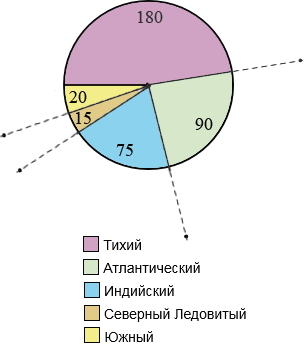 Аналогично строим остальные секторы. Мы построили круговую диаграмму площадей океанов (числа, указанные на секторах, обозначают площадь океана в млн км2).