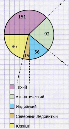 Аналогично строим остальные секторы. Мы построили круговую диаграмму площадей океанов (числа, указанные на секторах, обозначают площадь океана в млн км2).