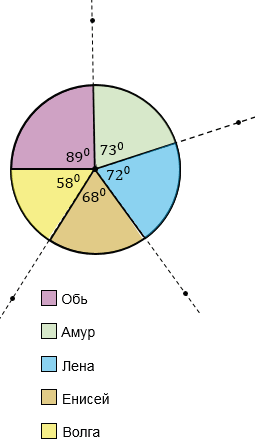 Все вычисления выполняем на калькуляторе. Обратите внимание, все значения градусов для рек, мы округлили до целых. Учитывая то, что в сумме все градусы должны дать ровно 3600, длине реки Лена мы поставили в соответствие 720, несмотря на то, что 72,60 нужно округлять до 730 (цель задачи - не точные вычисления, а умение строить диаграмму по данным и работать с ней).