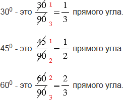 Даны углы, равные 300, 450, 600. Какую часть прямого угла составляют эти углы?