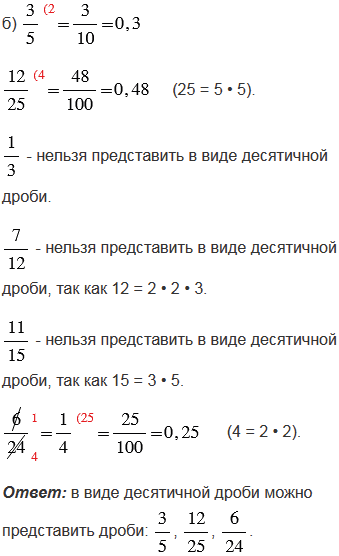 а) Чтобы обыкновенную дробь можно было представить в виде десятичной дроби, ее знаменатель при разложении на простые множители не должен содержать простых множителей отличных от 2 и 5, так как только из множителей 2 и 5, используя основное свойство дроби, мы можем получить дробь, у которой в знаменателе стоит единица с нулями (десятичную дробь), а затем записать эту дробь с помощью запятой.