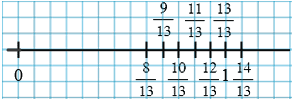 Чтобы изобразить данные дроби на координатной прямой, надо начертить координатную прямую, единичный отрезок которой равен 13 клеток, тогда 1 клетка тетради будет равна
