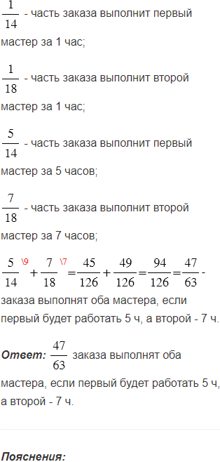 Первый мастер может выполнить заказ по пошиву карнавальных костюмов за 14 ч, а второй - за 18 ч. Какую часть заказа выполнят оба мастера, если первый будет работать 5 ч, а второй - 7 ч?