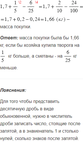 Хозяйка купила на рынке творог и сметану. Масса покупки составила 1,7 кг. Какова была бы масса покупки, если бы хозяйка купила творога на   кг больше, а сметаны - на кг меньше?