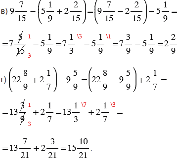 При выполнении вычислений в пунктах а) и б) для упрощения вычислений применяем переместительное и сочетательное свойства сложения, в пункте в) применяем свойство вычитания суммы из числа, в пункте г применяем свойство вычитания числа из сумы.