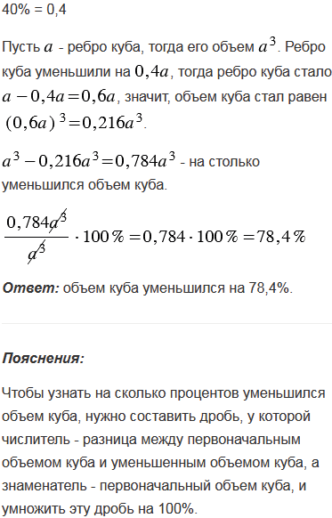 Каждое ребро куба уменьшили на 40%. На сколько процентов уменьшится объем куба?