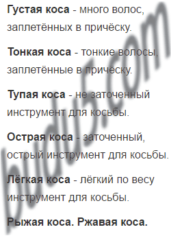 Густая коса, тонкая коса, тупая коса, острая коса, лёгкая коса.
