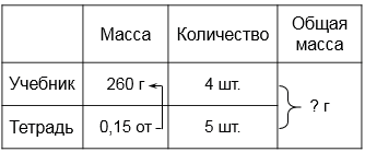 Масса одного учебника 260 г. Масса одной тетради составляет 0,15 массы учебника. Чему равна масса 4 учебников и 5 тетрадей?