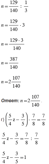 В пунктах в) и г) сначала решаем каждое уравнение относительно умножения, то есть находим неизвестный множитель (выражение в скобках), затем в пункте в) находим неизвестное слагаемое и далее снова находим неизвестный множитель, а в пункте г) находим неизвестное уменьшаемое и далее снова находим неизвестный множитель.