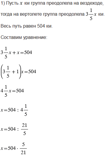 Группа волонтеров для уборки мусора на Крайнем Севере ч летела на вертолете, а затем еще ч ехала на вездеходе. При этом на вертолете она преодолела путь, в раза больший, чем на вездеходе. С какой скоростью группа передвигалась на вертолете и на вездеходе, если весь путь равен 504 км?