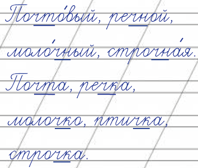 Почта, почто́вый (ящик), речка, речной (песок), молочко моло́чный (кисель), птичка, строчка, строчна́я (буква).