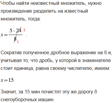 Пять снегоуборочных машин почистили дорогу за 24 мин. За какое время почистят эту же дорогу 8 снегоуборочных машин?