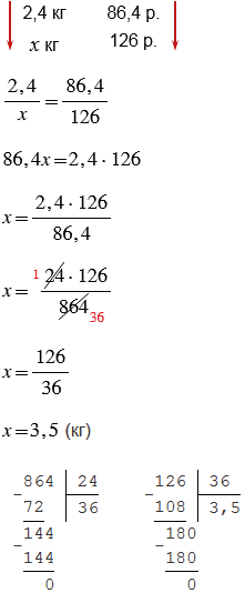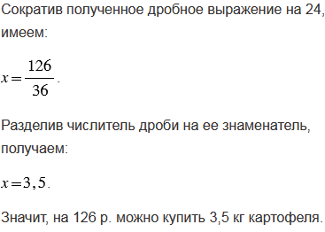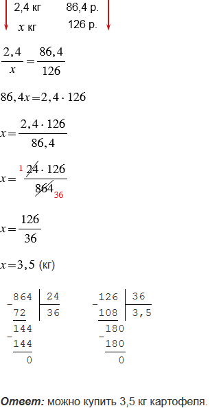 За 2,4 кг картофеля придется заплатить 86,4 р. Сколько купили картофеля, если за него заплатили 126 р.?