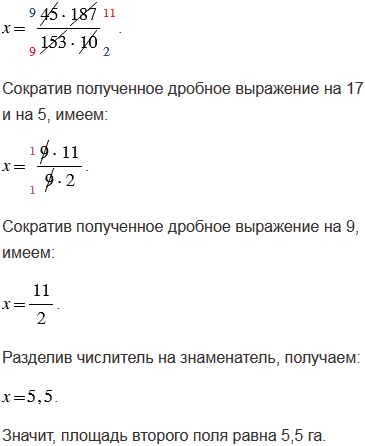 С первого поля площадью 4,5 га собрали 15,3 т ячменя. Какова площадь второго поля, если при одинаковой урожайности с него собрали 18,7 т ячменя?