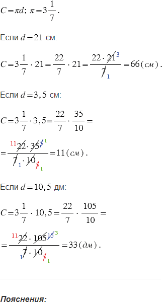 Найдите длину окружности, если её диаметр равен 21 см; 3,5 см; 10,5 дм. Число