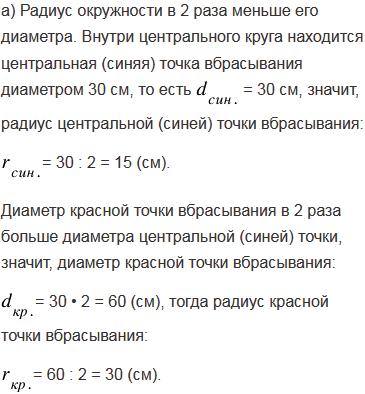 а) Внутри центрального круга находится центральная (синяя) точка вбрасывания диаметром 30 см, а в нейтральной зоне находятся точки вбрасывания (красные), диаметр которых в 2 раза больше диаметра центральной точки. Во сколько раз площадь красной точки вбрасывания больше площади синей точки?