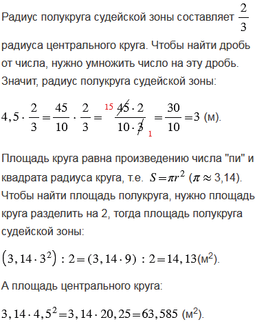 радиуса центрального круга. Найдите площадь полукруга судейской зоны. Какую часть площади центрального круга она занимает?